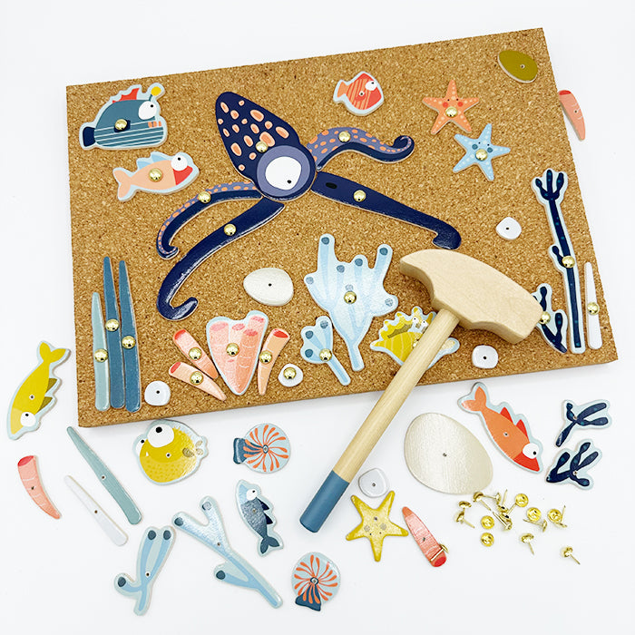 Kreativ-Set für kleine Tiefseetaucher! Ausgestattet mit Korkbrett, Holzhammer, Ziernägeln und unterschiedlichen Bildelementen aus Schichtholz, lassen sich mit diesem Hämmerchenspiel Motive aus der zahlreichen Unterwasserwelt erschaffen. Unterschiedliche Meeresbewohner, Korallen, Steine und ein großer Kraken, der aus mehreren Teilen zusammengesetzt werden kann, sorgen für abwechslungsreichen Spielspaß und ermöglichen die Gestaltung individueller Hämmerchenbilder. Das Geschicklichkeitsspiel fördert spielend die Kreativität und gibt Raum für eigene Kreationen und Bilder. Es überzeugt außerdem durch den hochwertigen Druck mit detailreichen und kindgerechten Grafiken sowie die moderne Farbgebung in den Trendfarben Senfgelb, Koralle und Rauchblau.