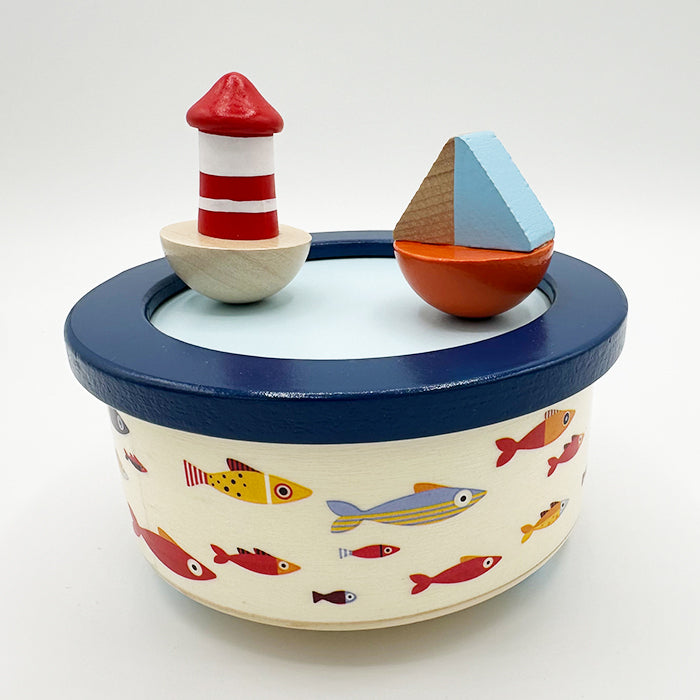 Maritime Spieluhr aus Holz, die Kinder mit der traumhaften Melodie des Schlafliedes „Weißt Du, wieviel Sternlein stehen“ sanft in den Schlaf begleitet. Der Leuchtturm und das Segelboot bewegen sich im Kreis, während die Melodie spielt. Die beiden Holzfiguren sind abnehmbar und dank leichter Handhabung kann die Spieluhr auch von Kindern selbstständig bedient werden. Die Spieluhr, deren zentrales Designelement das Meer und seine Bewohner sind, überzeugt mit niedlichen, kindgerechten Details. Das macht die Spieluhr zu einem dekorativen Hingucker im Kinderzimmer, der Kinder durch die traumhafte Musik beruhigt und für Entspannung sorgt. Abgerundete Kanten sorgen für eine angenehme Haptik.