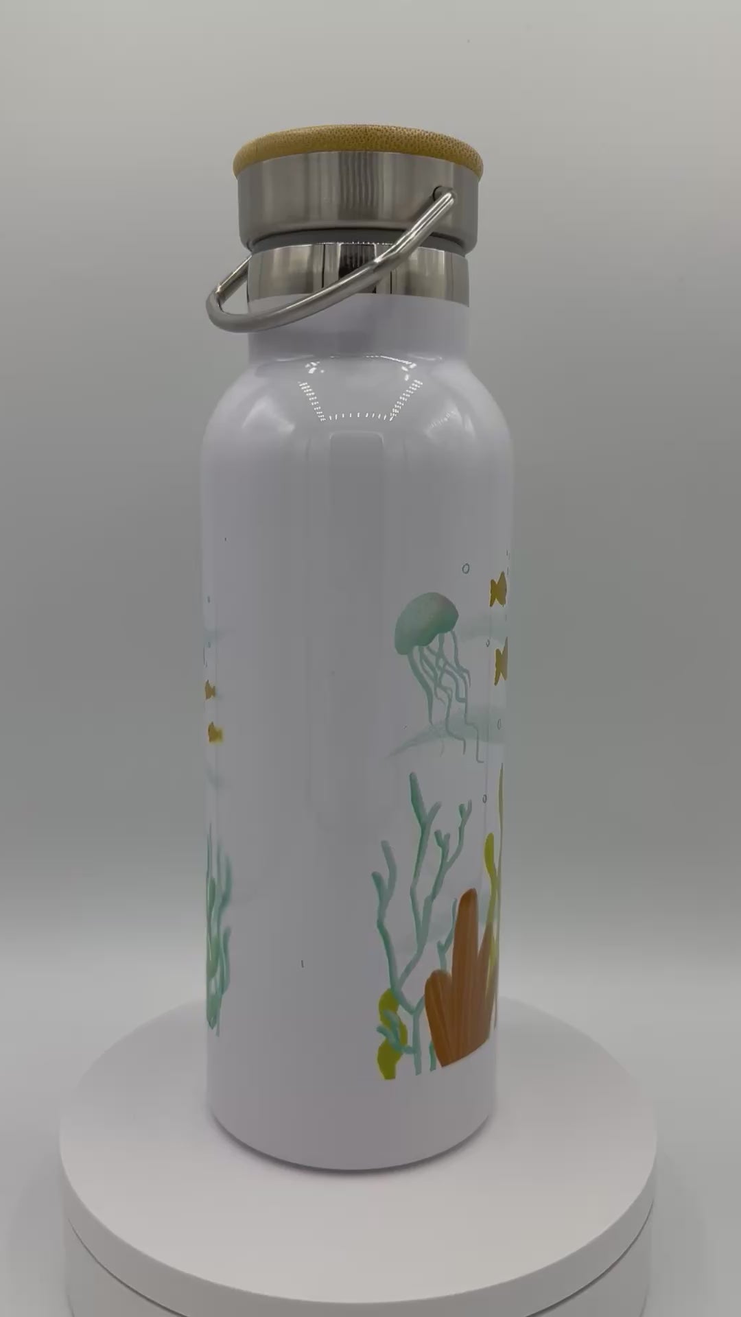 "Unsere Trinkflasche mit Ozean-Motiv hat die perfekte Größe und Stabilität für Kinder: mit einem Fassungsvermögen von 500ml passt sie in jeden Kindergartenrucksack. Sie ist doppelwandig, besteht aus Edelstahl und hat einen schönen Bambusdeckel mit einem kleinen Henkel. Von Hand spülen."