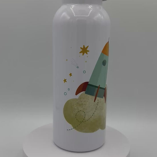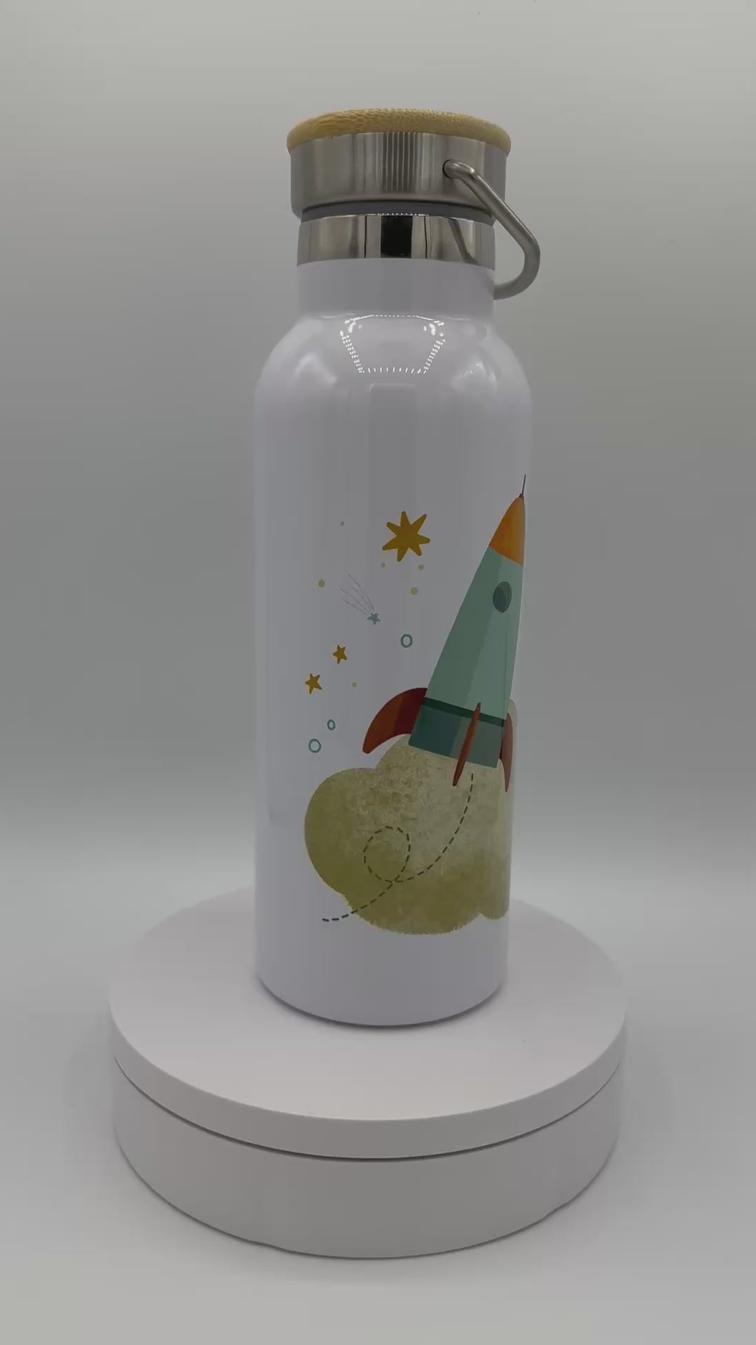 "Unsere Trinkflasche mit Weltraum-Motiv hat die perfekte Größe und Stabilität für Kinder: mit einem Fassungsvermögen von 500ml passt sie in jeden Kindergartenrucksack. Sie ist doppelwandig, besteht aus Edelstahl und hat einen schönen Bambusdeckel mit einem kleinen Henkel. Von Hand spülen."